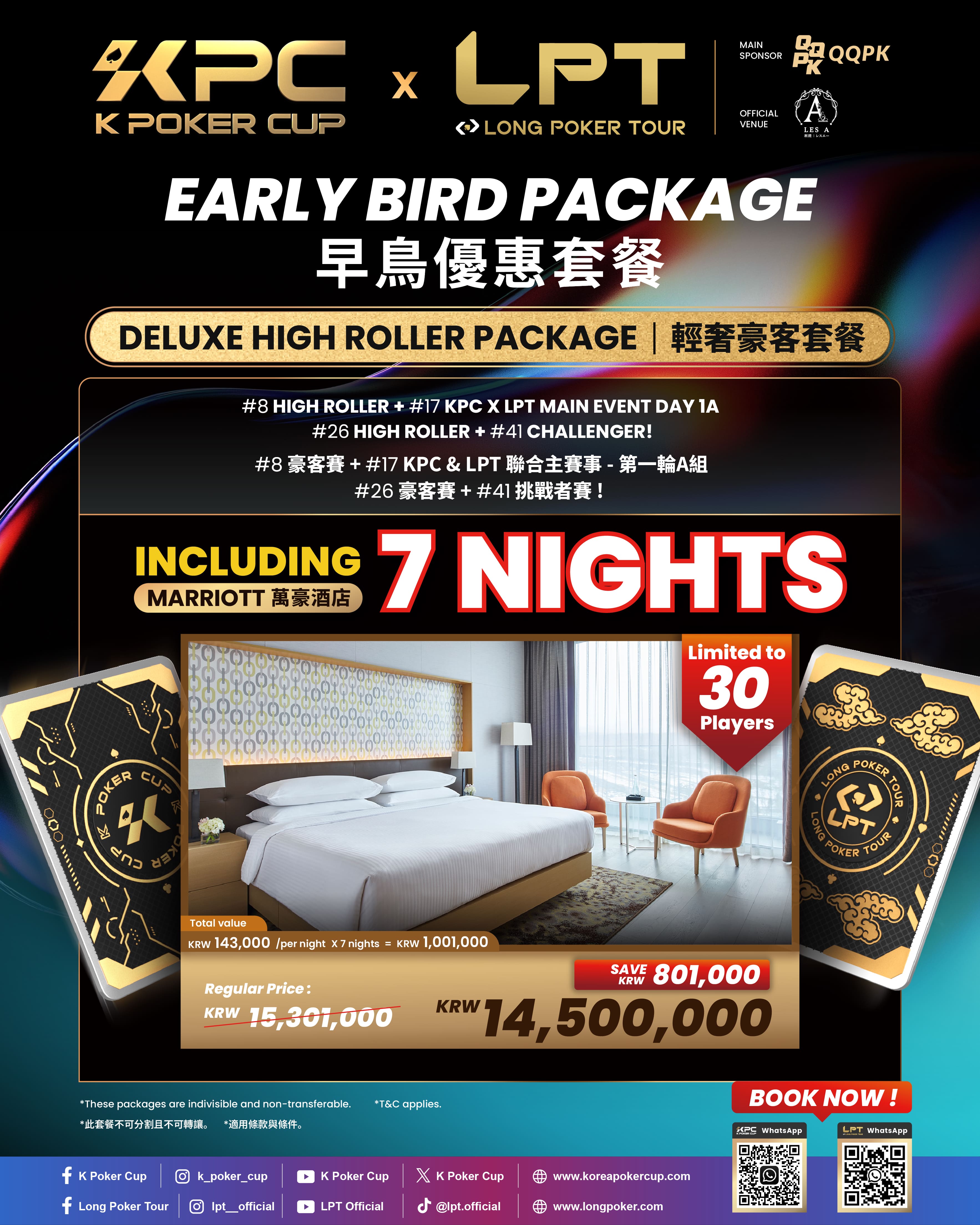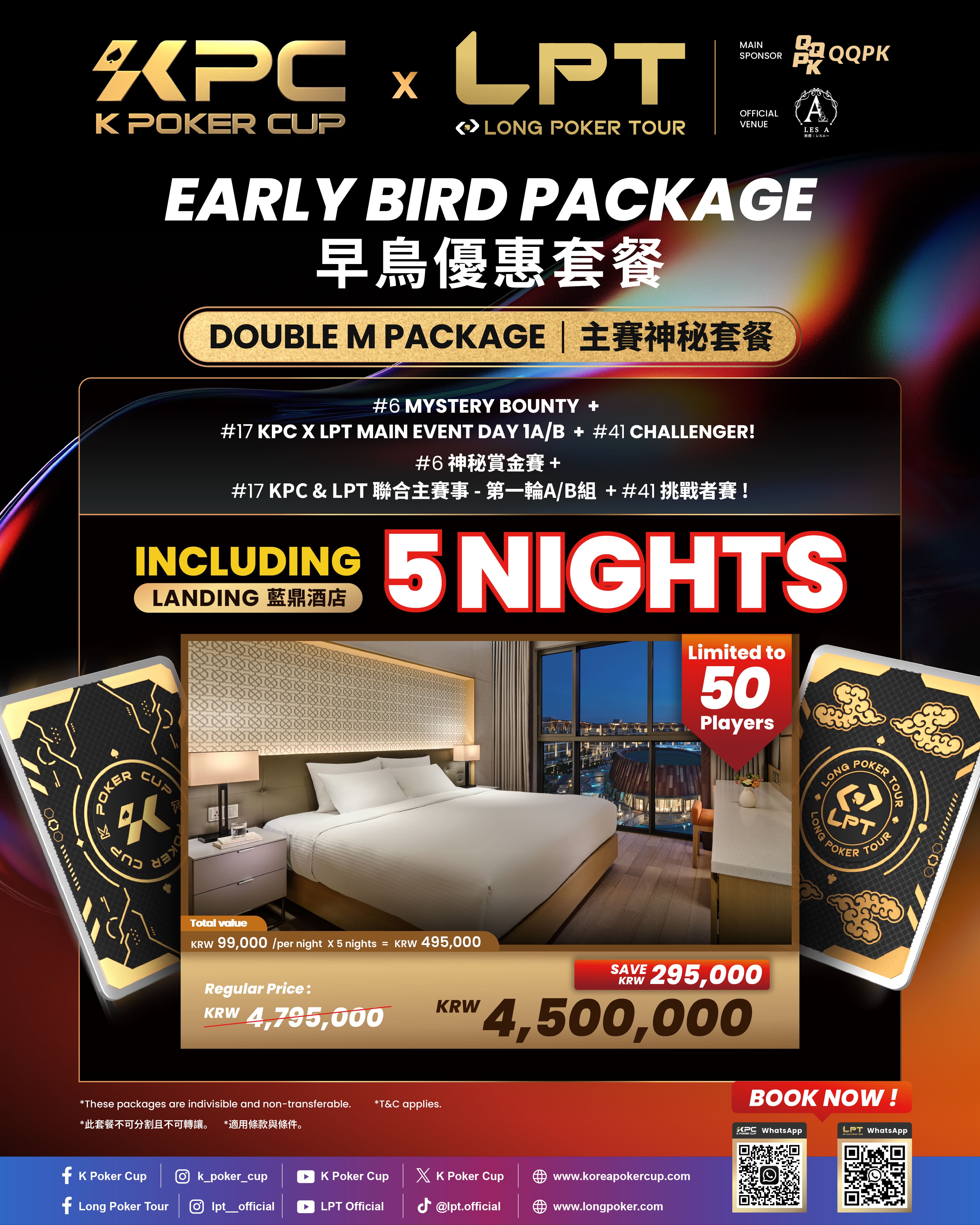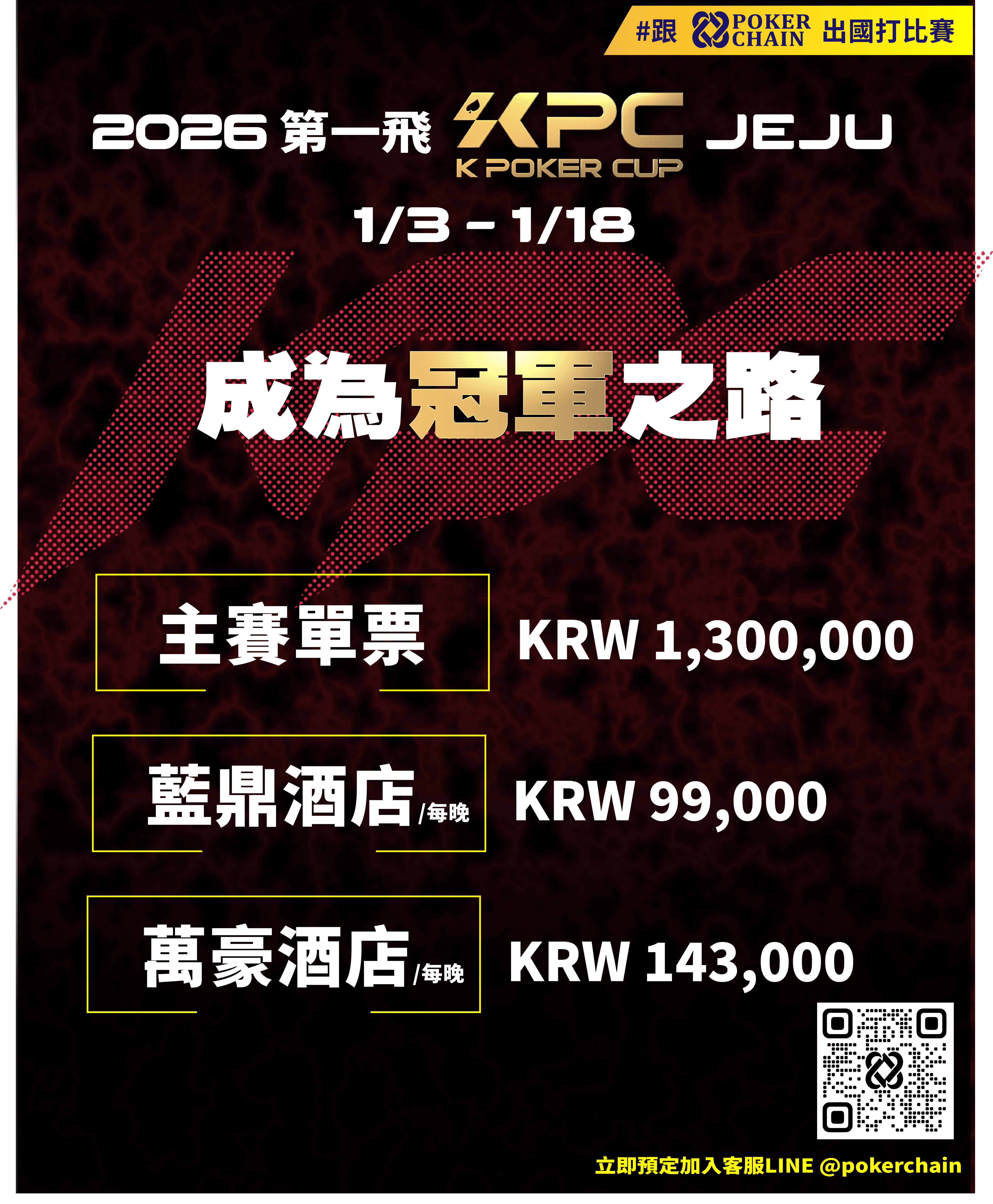 PokerChain單買方案✔️主賽單票 KRW 1,300,000✔️藍鼎酒店 KRW 99,000/晚✔️萬豪酒店 KRW 143,000/晚- 當日匯率+3﹪手續費KPC官方方案✔️藍鼎5晚 KRW 4,500,000✔️萬豪7晚 KRW 14,500,000