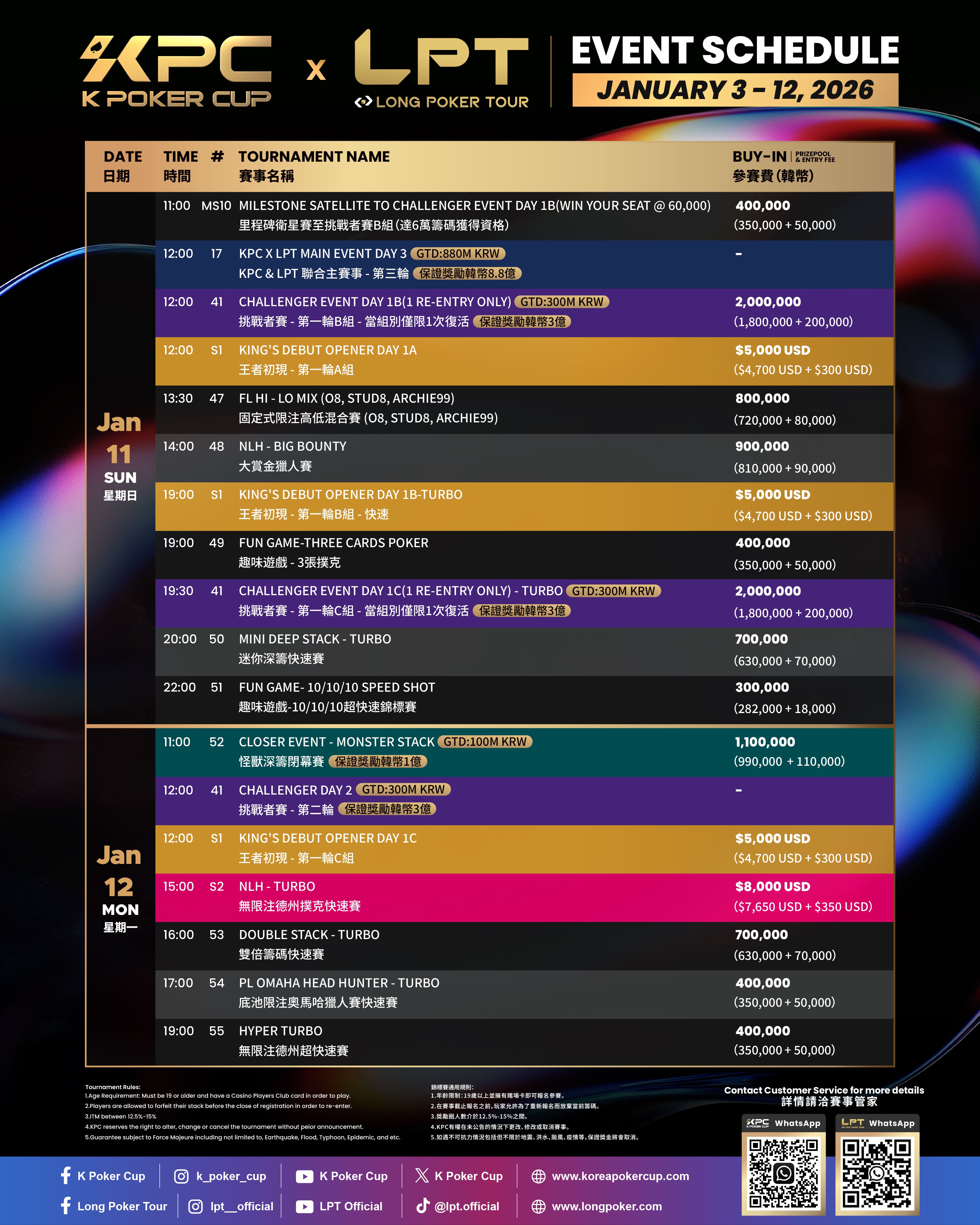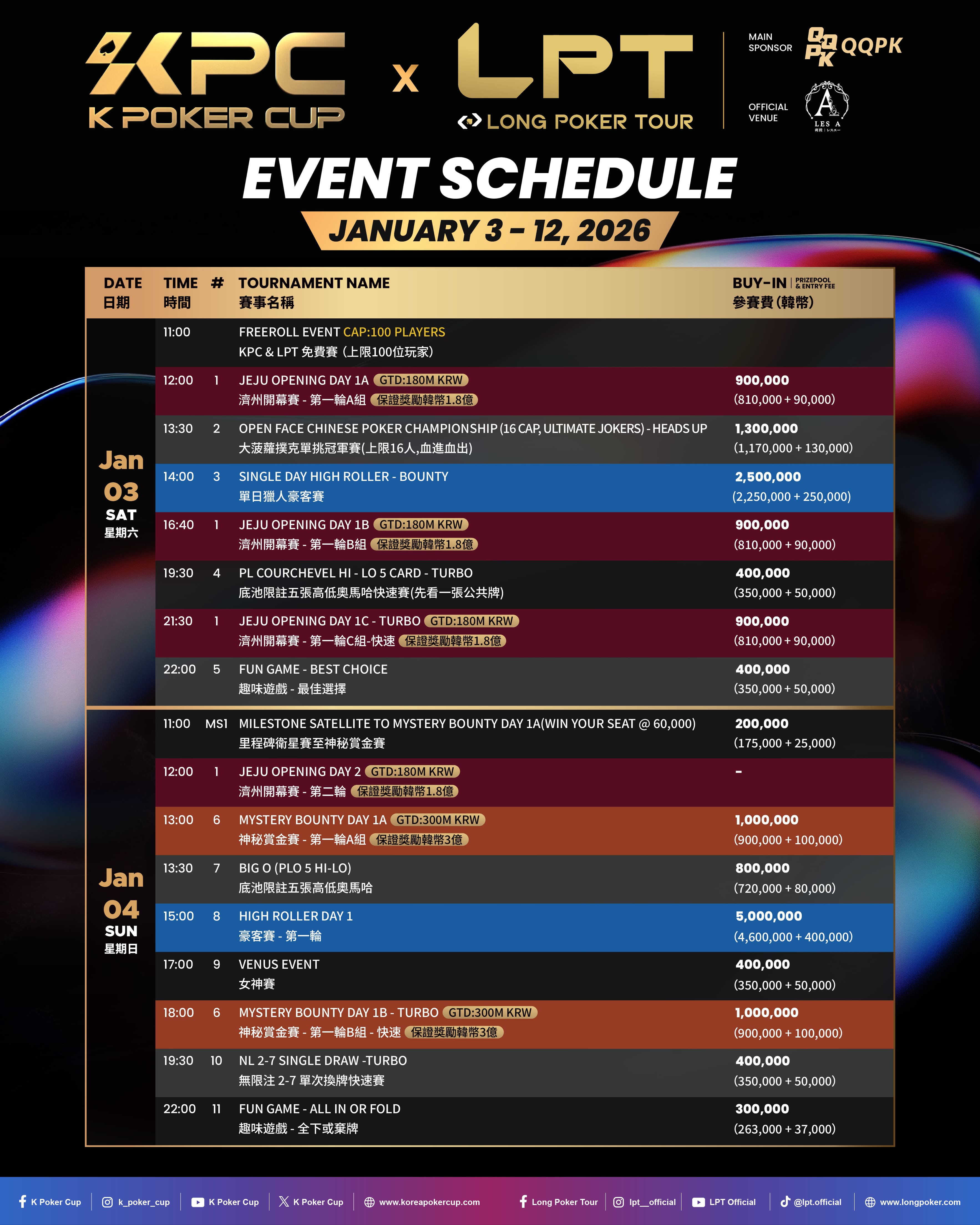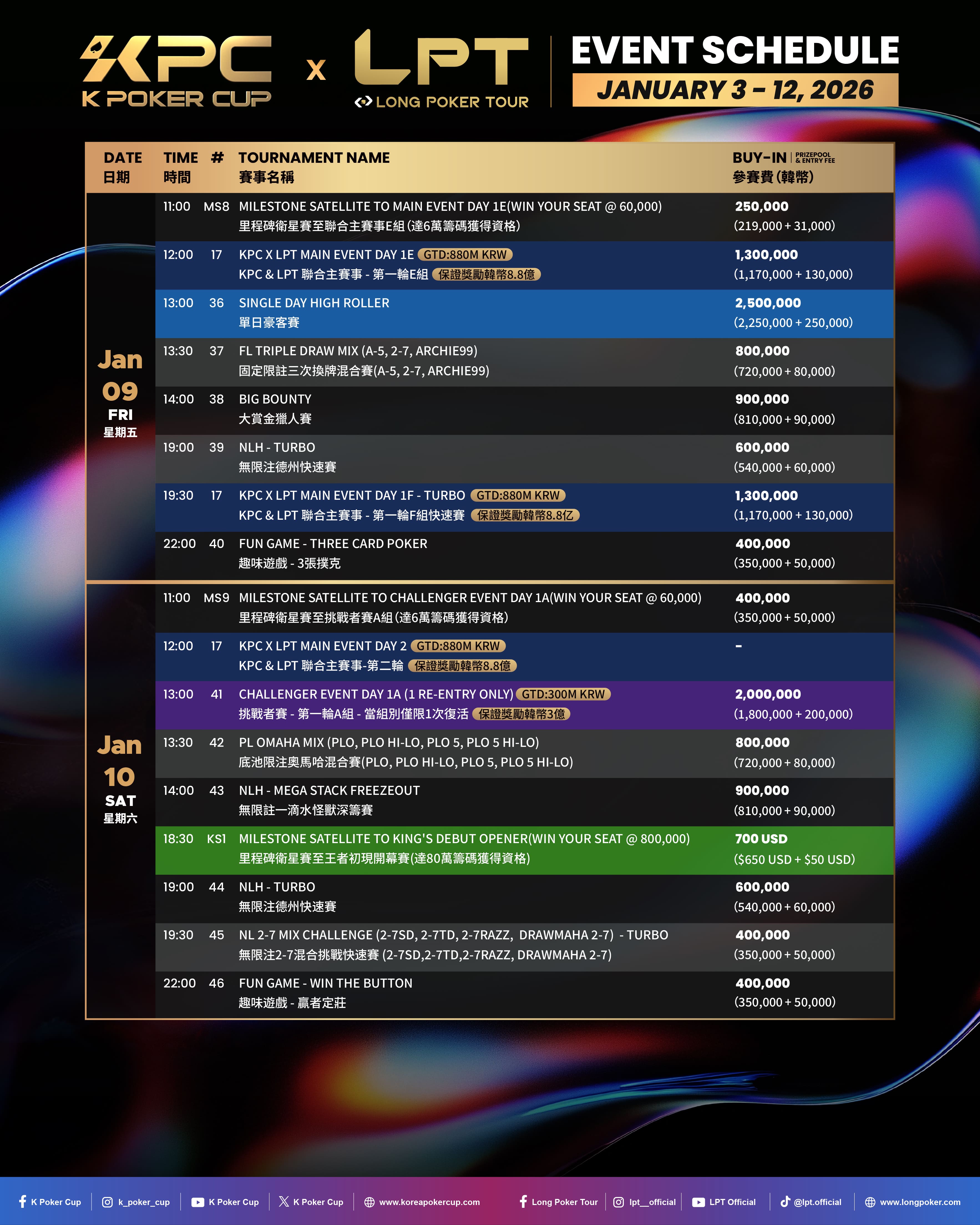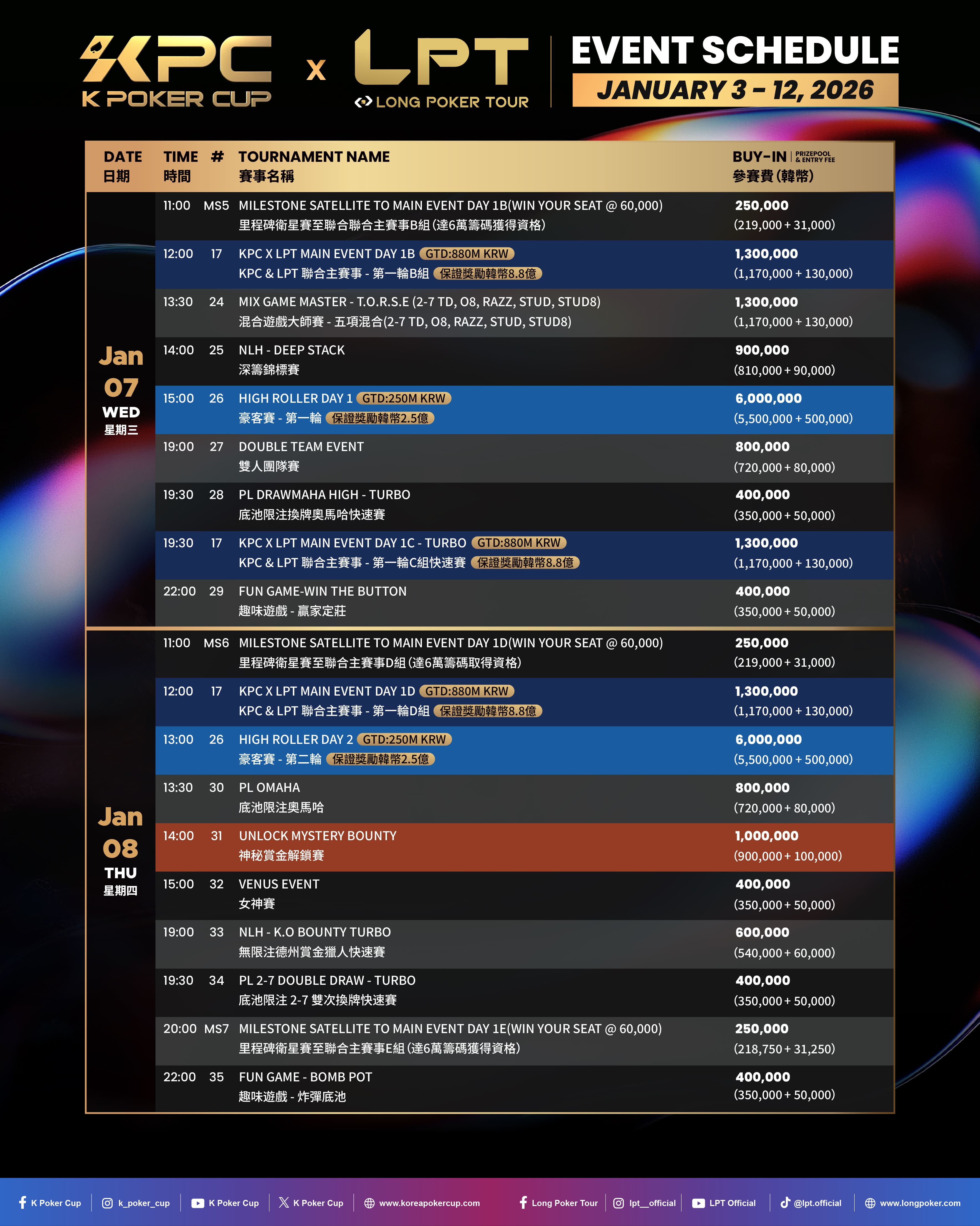 PokerChain單買方案✔️主賽單票 KRW 1,300,000✔️藍鼎酒店 KRW 99,000/晚✔️萬豪酒店 KRW 143,000/晚- 當日匯率+3﹪手續費KPC官方方案✔️藍鼎5晚 KRW 4,500,000✔️萬豪7晚 KRW 14,500,000